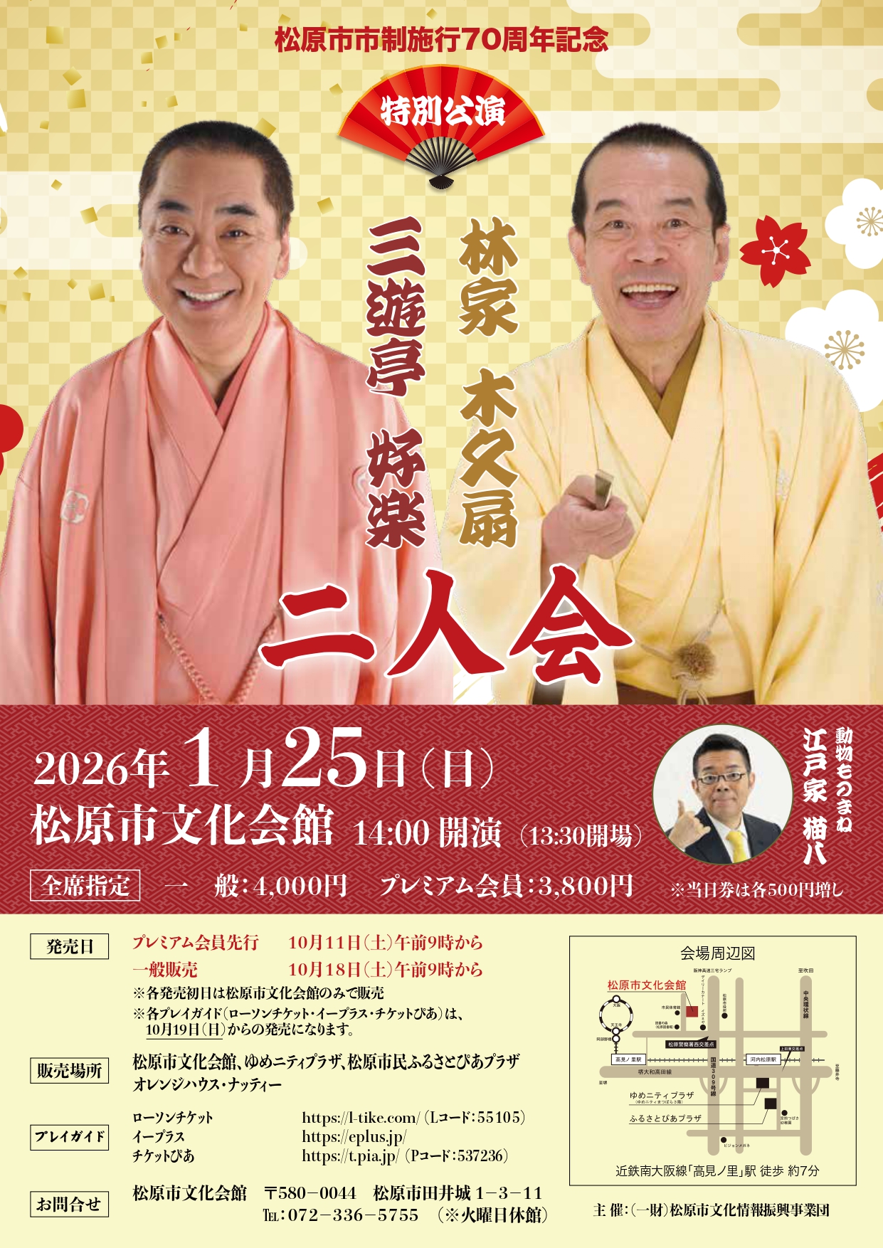 2026年1月25日(日)開催 松原市市制施行70周年記念 林家木久扇・三遊亭好楽二人会